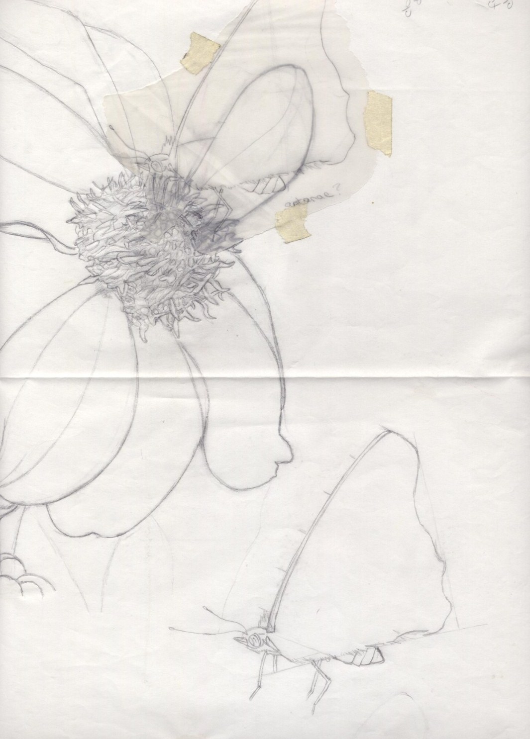 The dahlia was growing in my garden so I took a photograph for reference and started planning out the image by pinning the butterfly onto polystyrene. I used a magnifying glass to see the fine details.