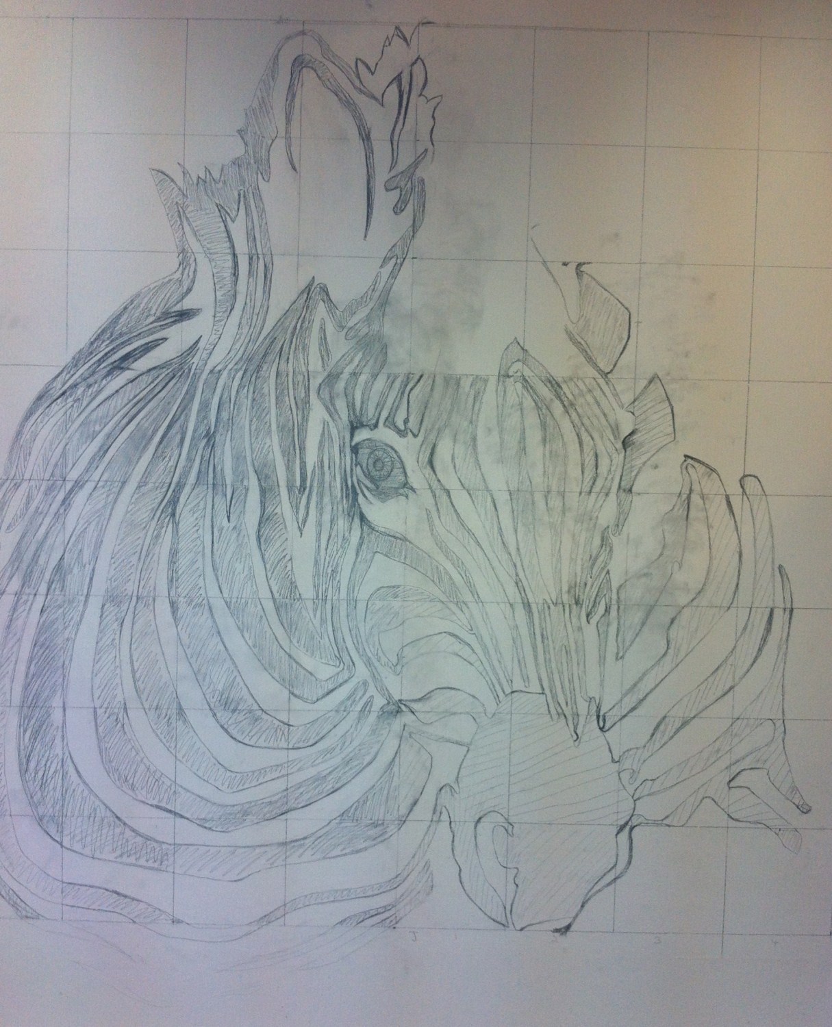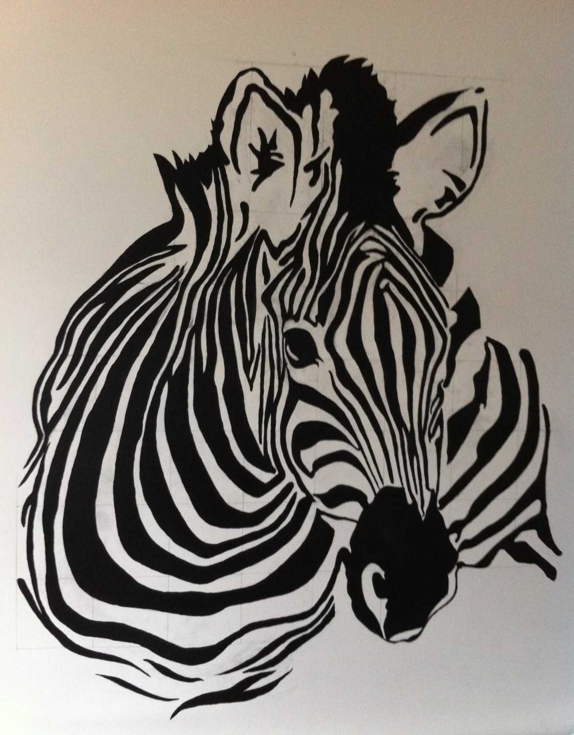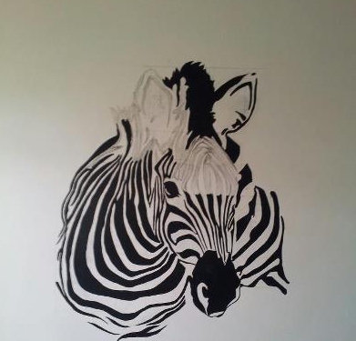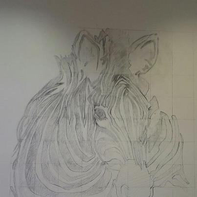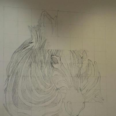 After drawing out the initial image we scaled it up and then marked a larger grid on the wall, each of us began drawing from either side filling in each section until we met in the middle. I must confess that Kelly drew the majority of the top also due to the fact that she is far taller than me!